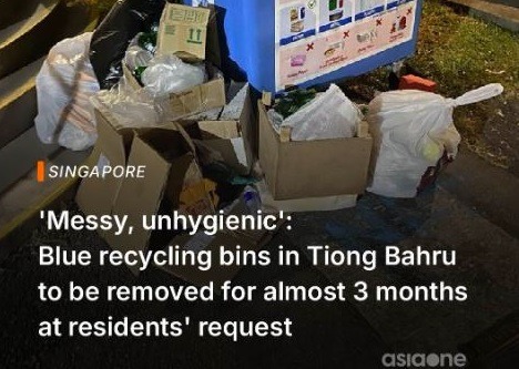 Blue recycling bins in Tiong Bahru estate to vanish for almost three months.