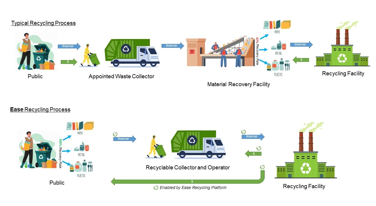 Ease, the digital recycling platform, simplies existing recycling procsesses and create incentive for all parties involved. Snap a photo of recyclables, faciliate the collecion, the community is free to play any part in reducing landfills while enjoying greater convenience.